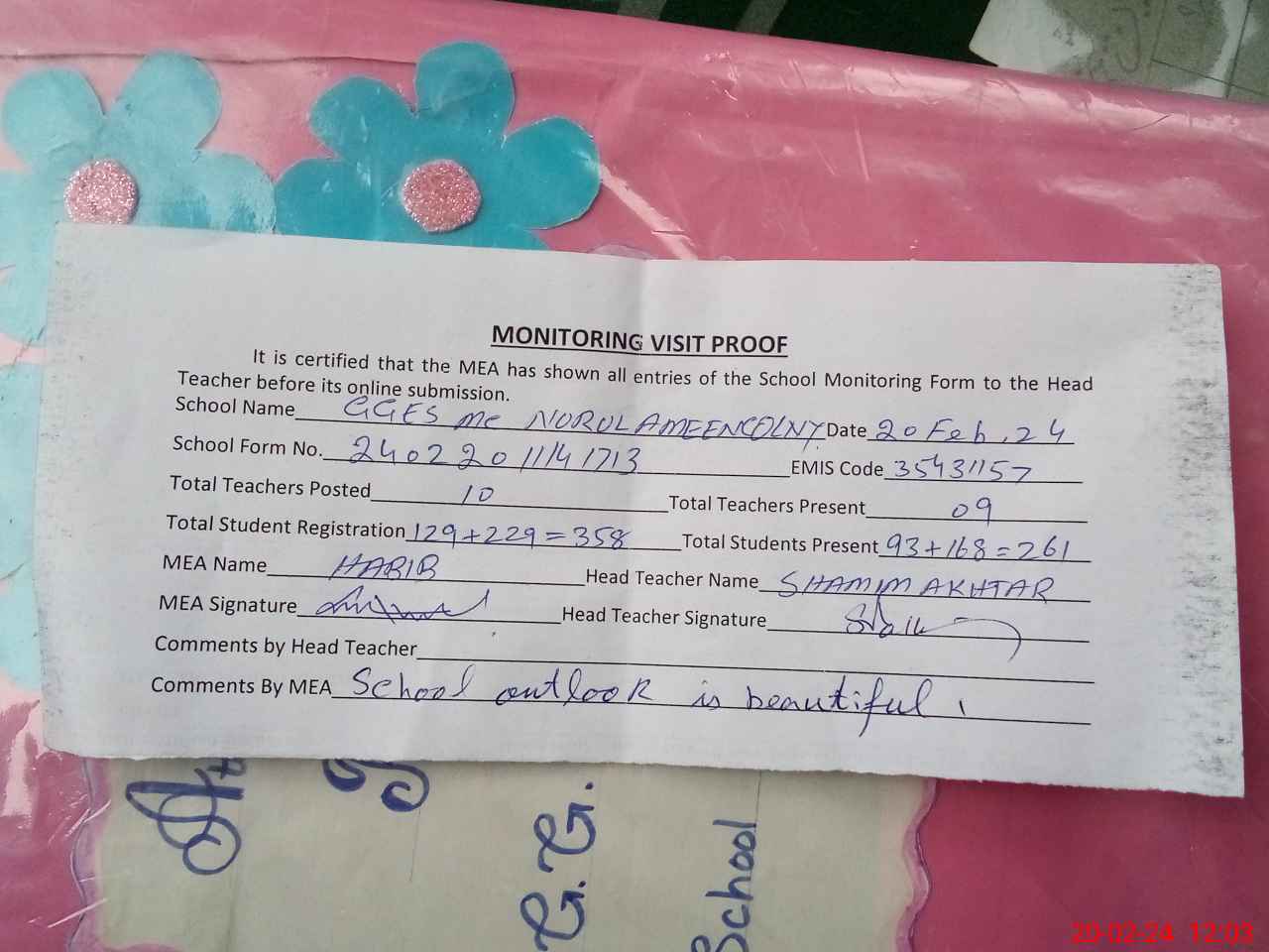 | Attendance Register | Head Teacher | MEA with School | Visit Proof |