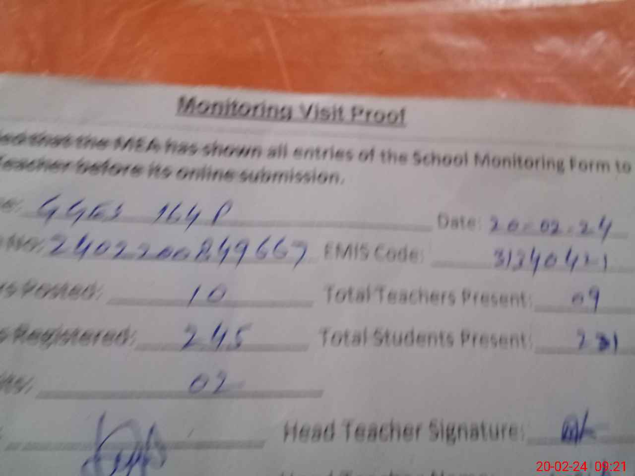 | Attendance Register | Head Teacher | MEA with School | Visit Proof |