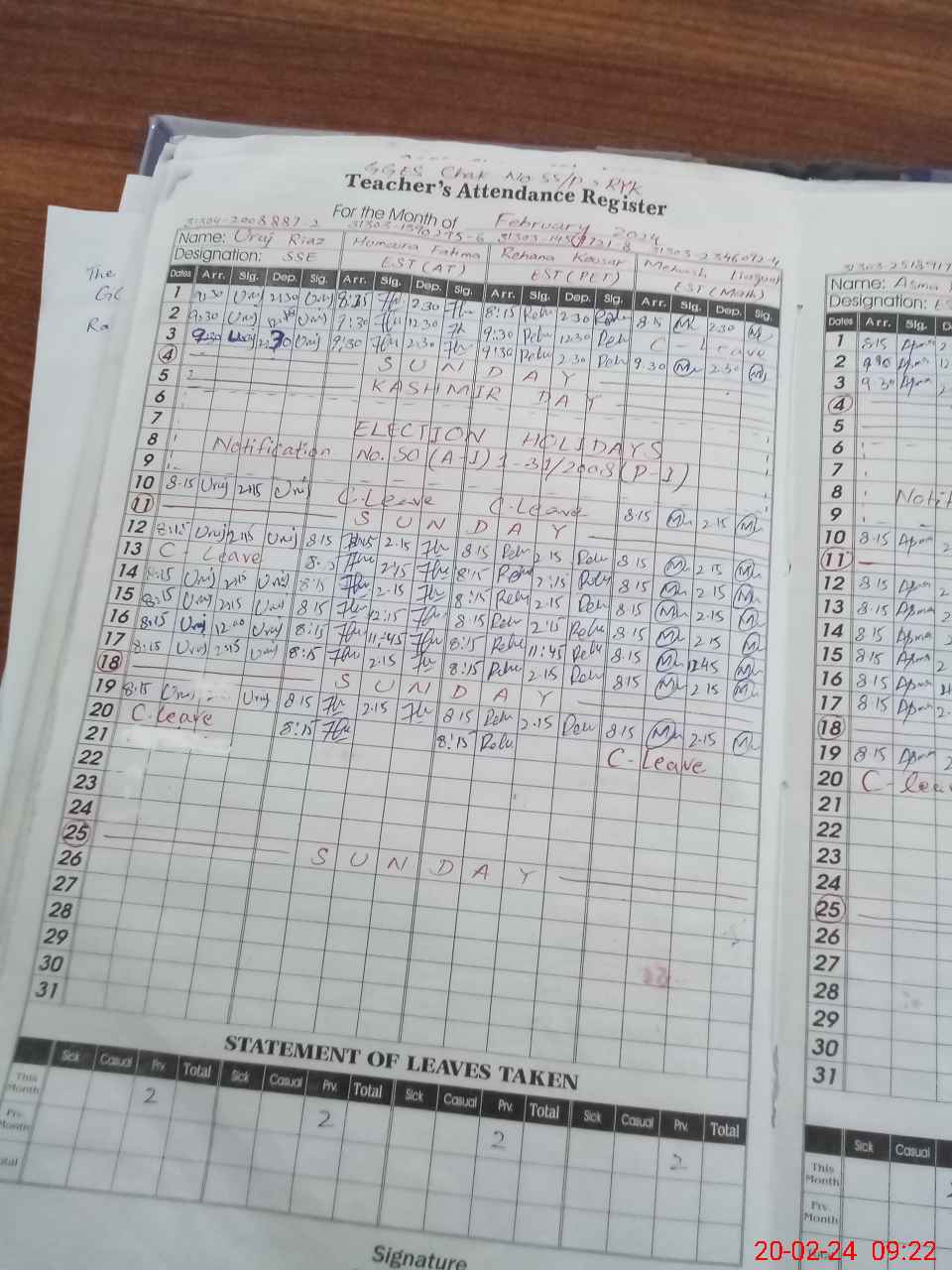 | CNIC | Full Name | Designation | R/C | Absence During Last Calender Month |