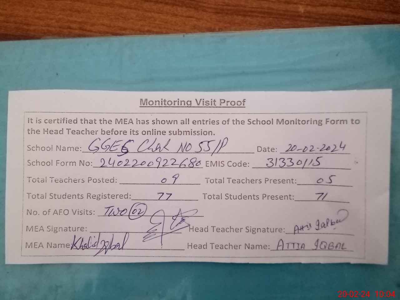 | Attendance Register | Head Teacher | MEA with School | Visit Proof |