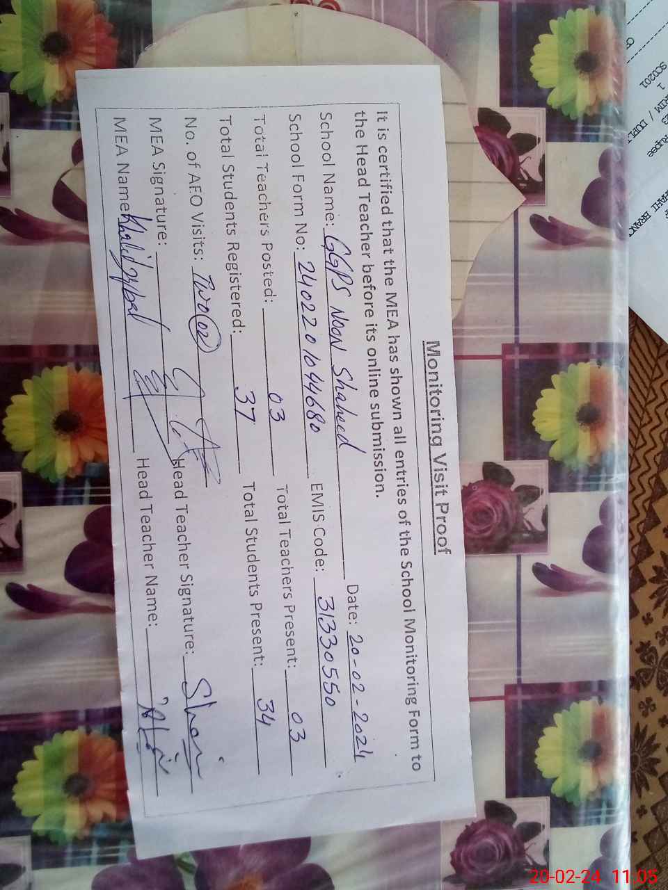 | Attendance Register | Head Teacher | MEA with School | Visit Proof |
