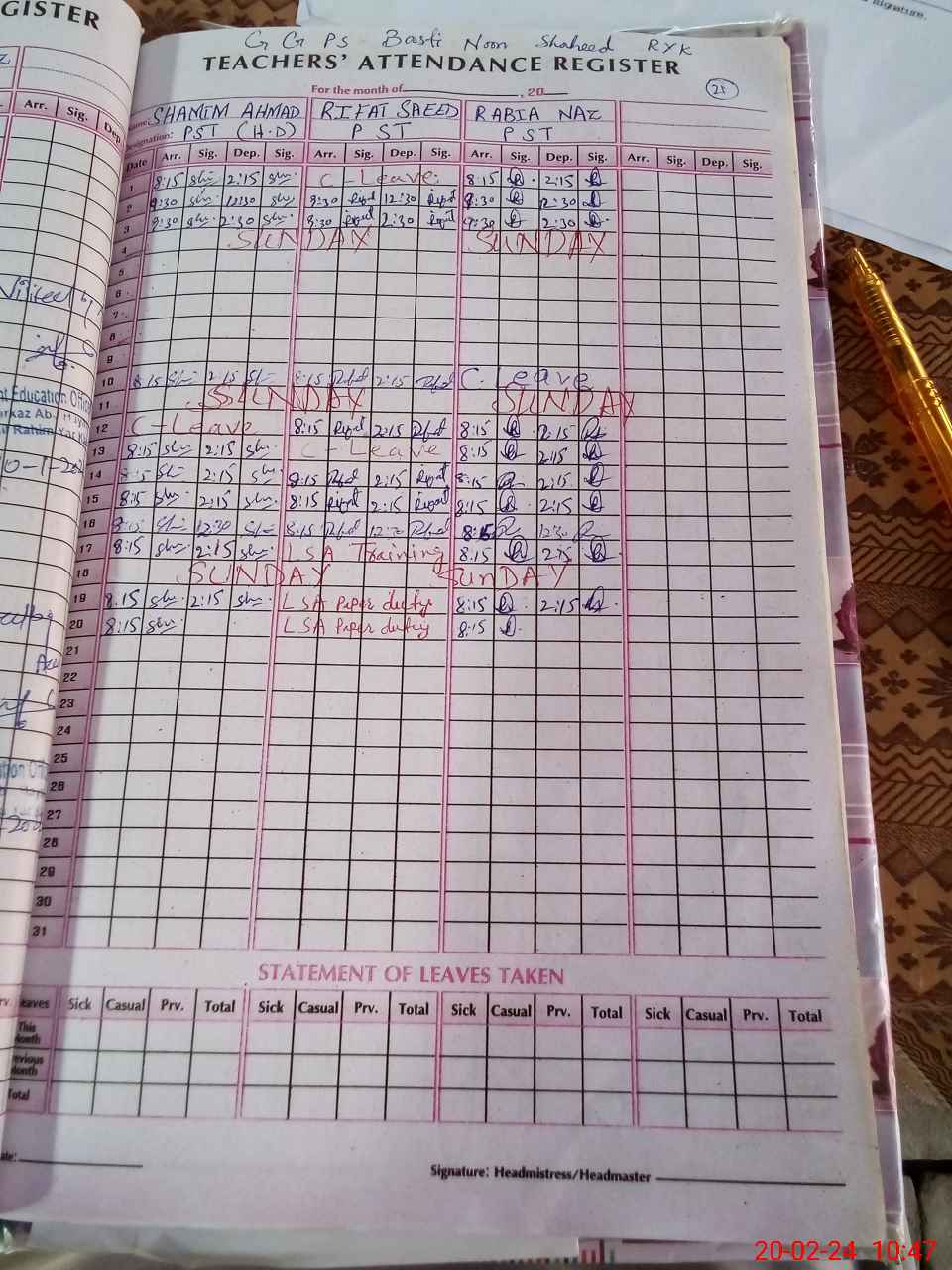 | 31**** | Ri**** Sa**** | PST | Regular | 0 | 0 | 0 | 0 | 0 | 0 | 0 | 0 | 0 | Exam Duty |