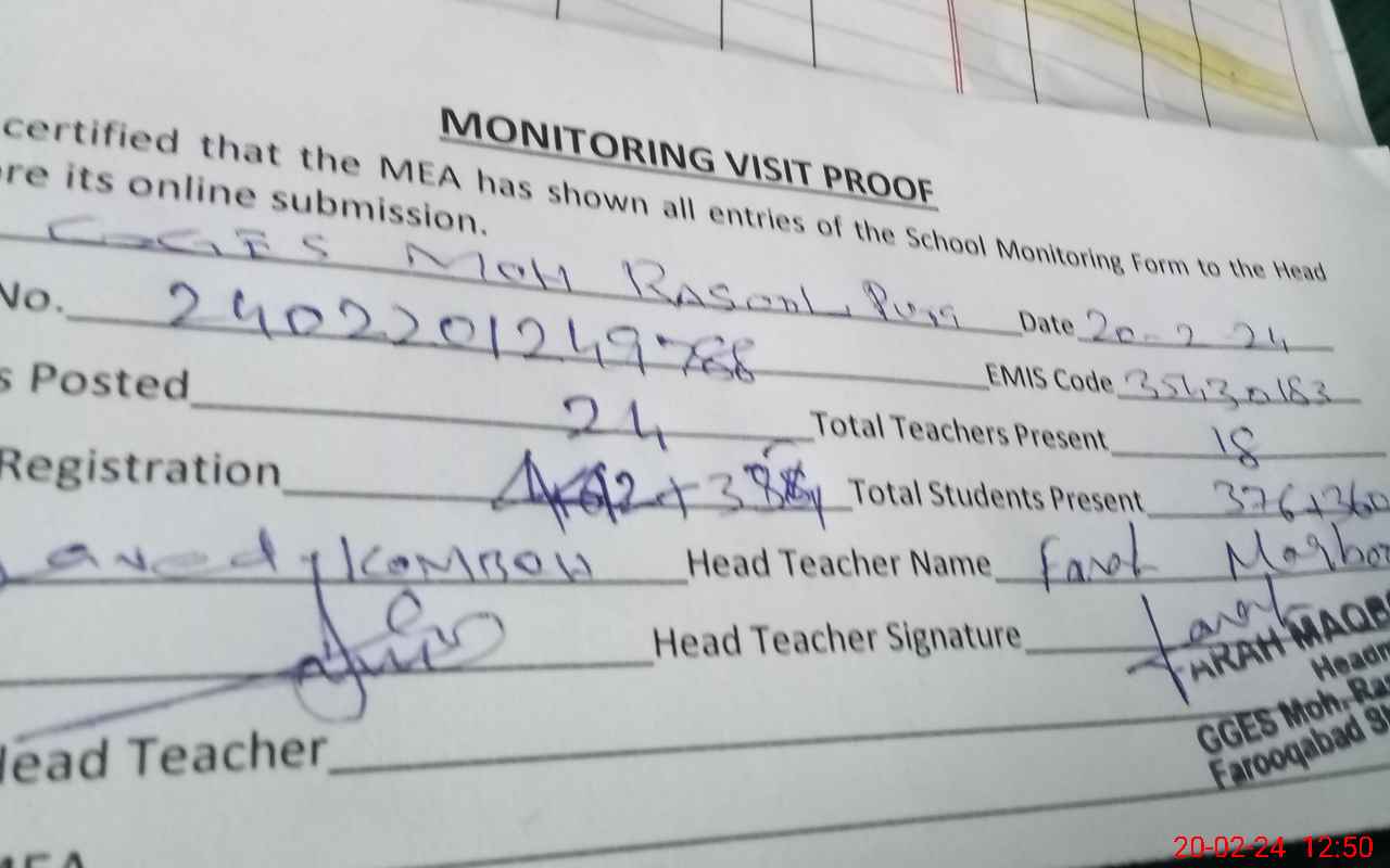 | Attendance Register | Head Teacher | MEA with School | Visit Proof |