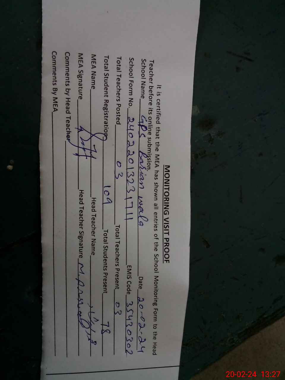 | Attendance Register | Head Teacher | MEA with School | Visit Proof |