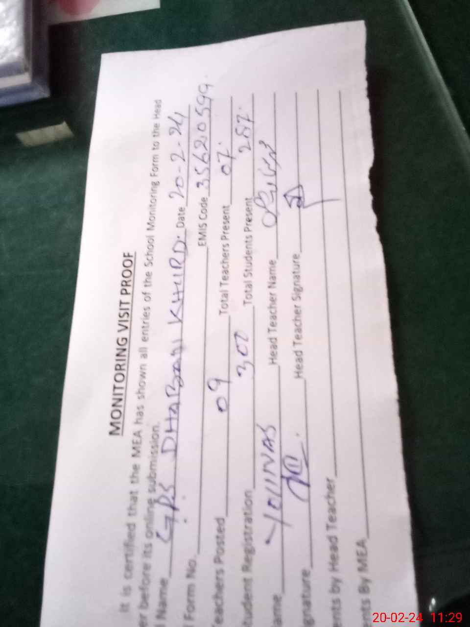| Attendance Register | Head Teacher | MEA with School | Visit Proof |