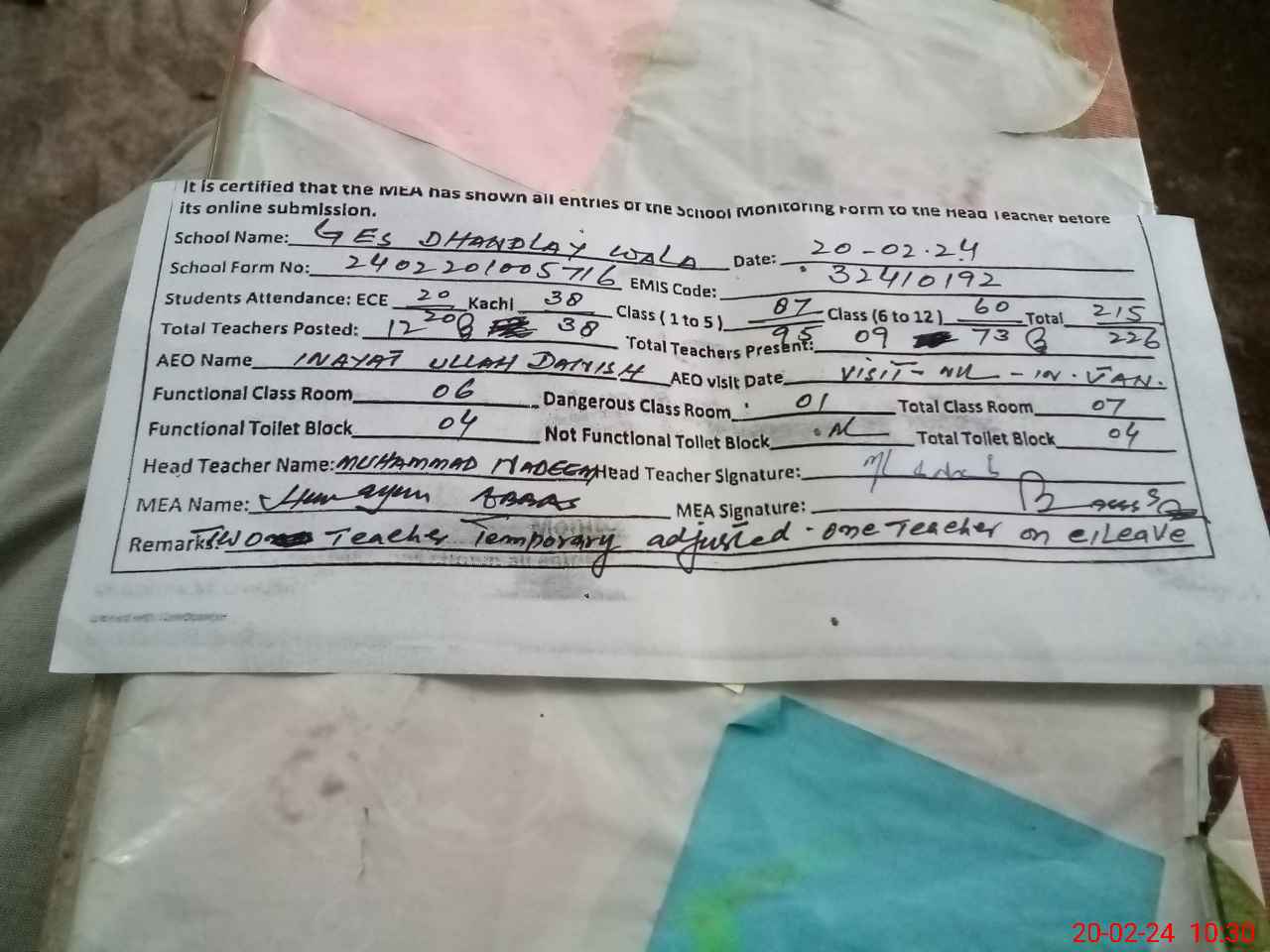 | EMIS Code: 32410192 | Name of School: GES BASTI DHANDLAY WALA | |||