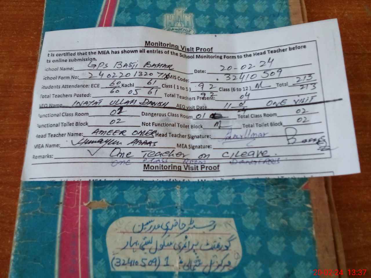 | Attendance Register | Head Teacher | MEA with School | Visit Proof |
