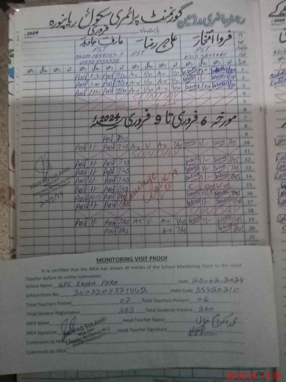 | Attendance Register | Head Teacher | MEA with School | Visit Proof |