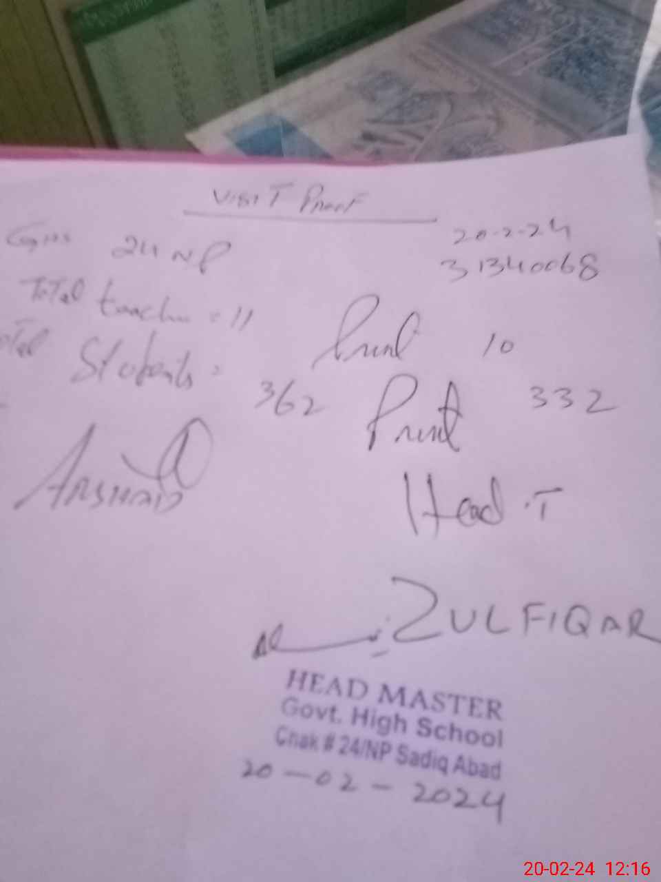 | Name: Zu**** Al**** Designation: (School Headmaster's/Headmistress's) SST Phone/Cell Number: 03**** |