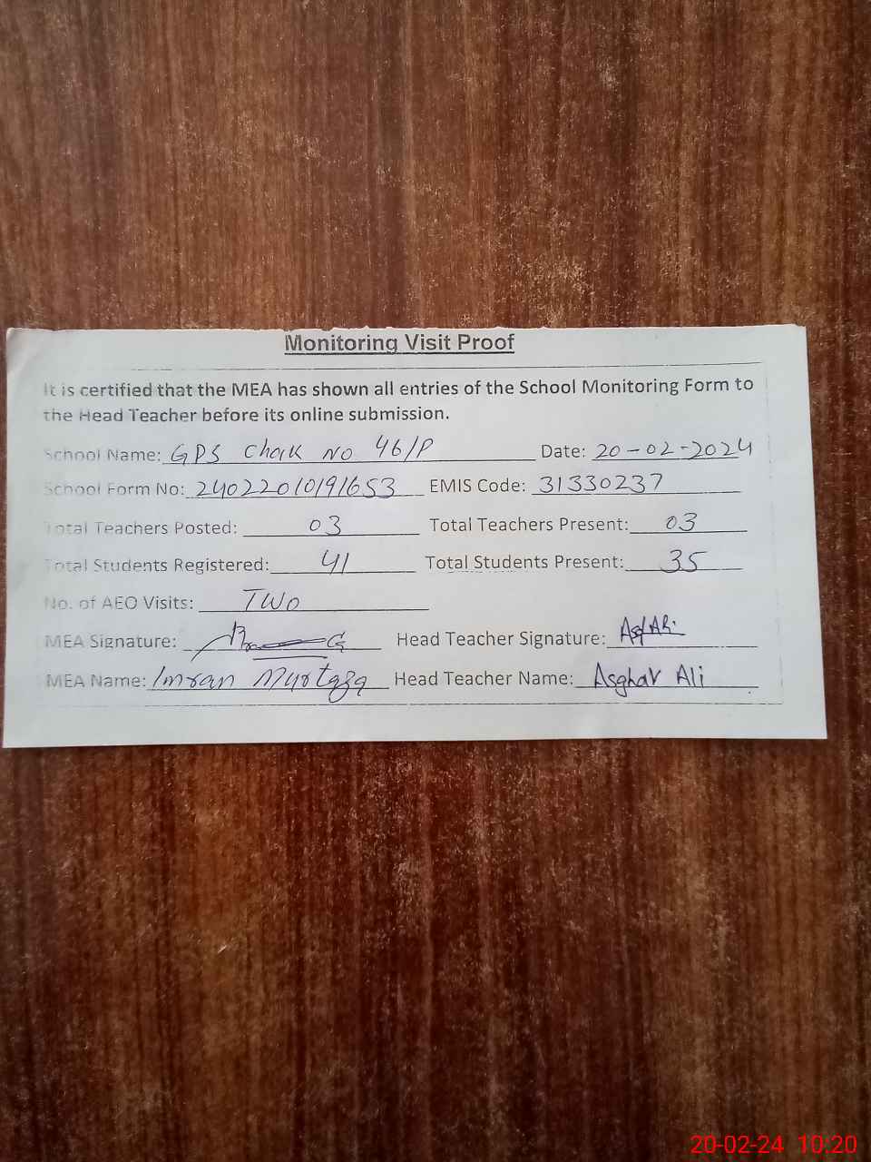 | Attendance Register | Head Teacher | MEA with School | Visit Proof |