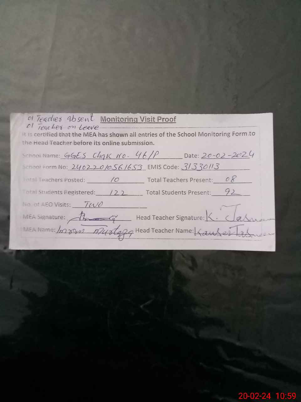 | Attendance Register | Head Teacher | MEA with School | Visit Proof |