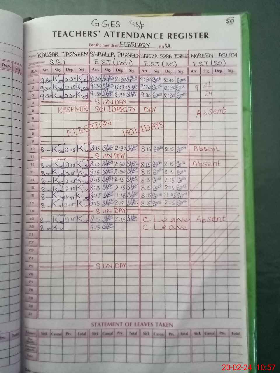| Leave | Duty | Absent | Maternity | Medical | Ex- Pak |