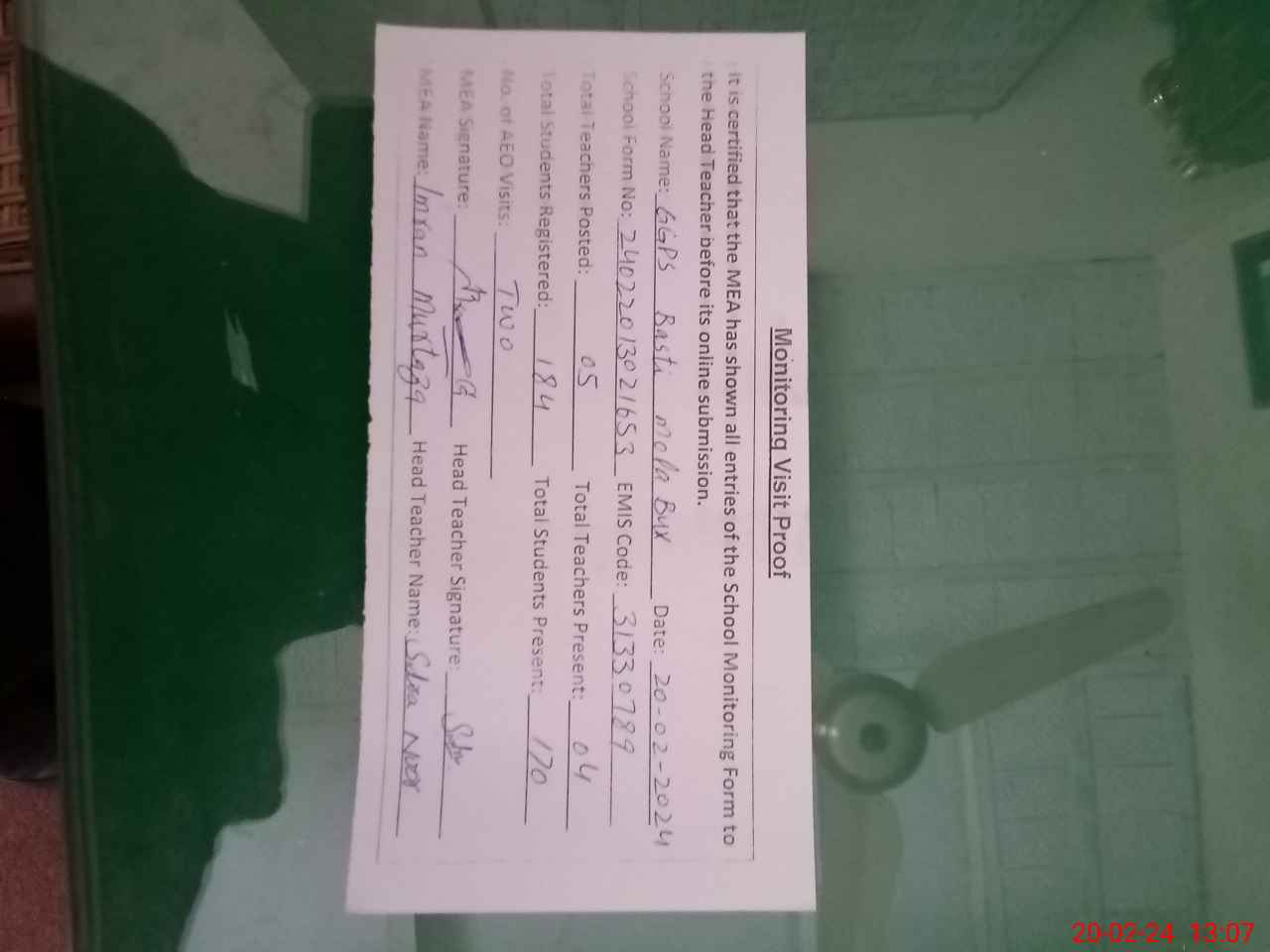 | Attendance Register | Head Teacher | MEA with School | Visit Proof |