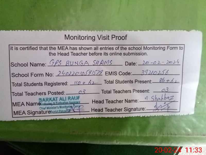| EMIS Code: 39210256 | Name of School: GPS BUNGA SHAMS | |||