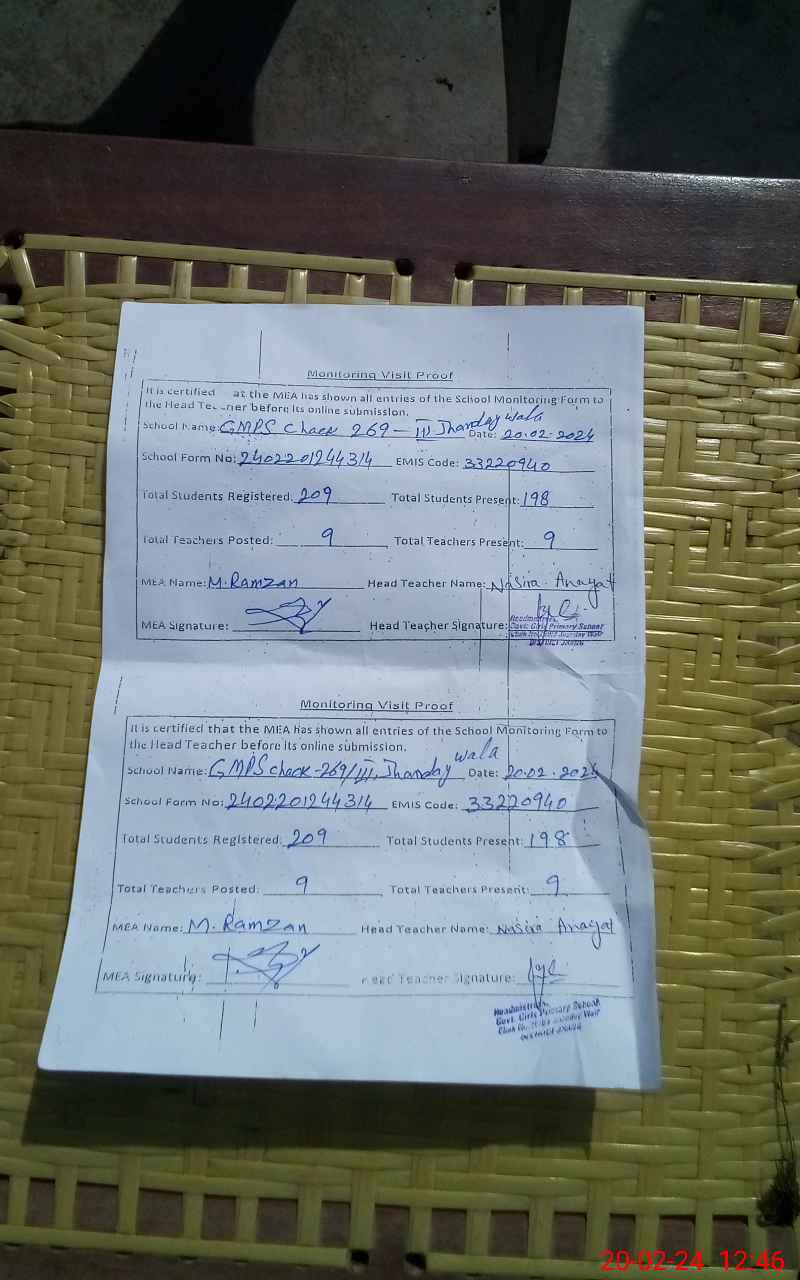 | EMIS Code: 33220940 | Name of School: GMPS CHAK 269/3 JHANDAY WALA (April-2016) | |||