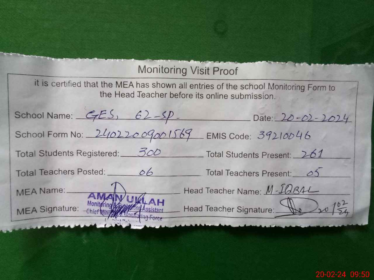 | Certified that this School was Inspected by the Undersigned MEA/DMO Today and the Information Stated Above is as Per Record. | |||||