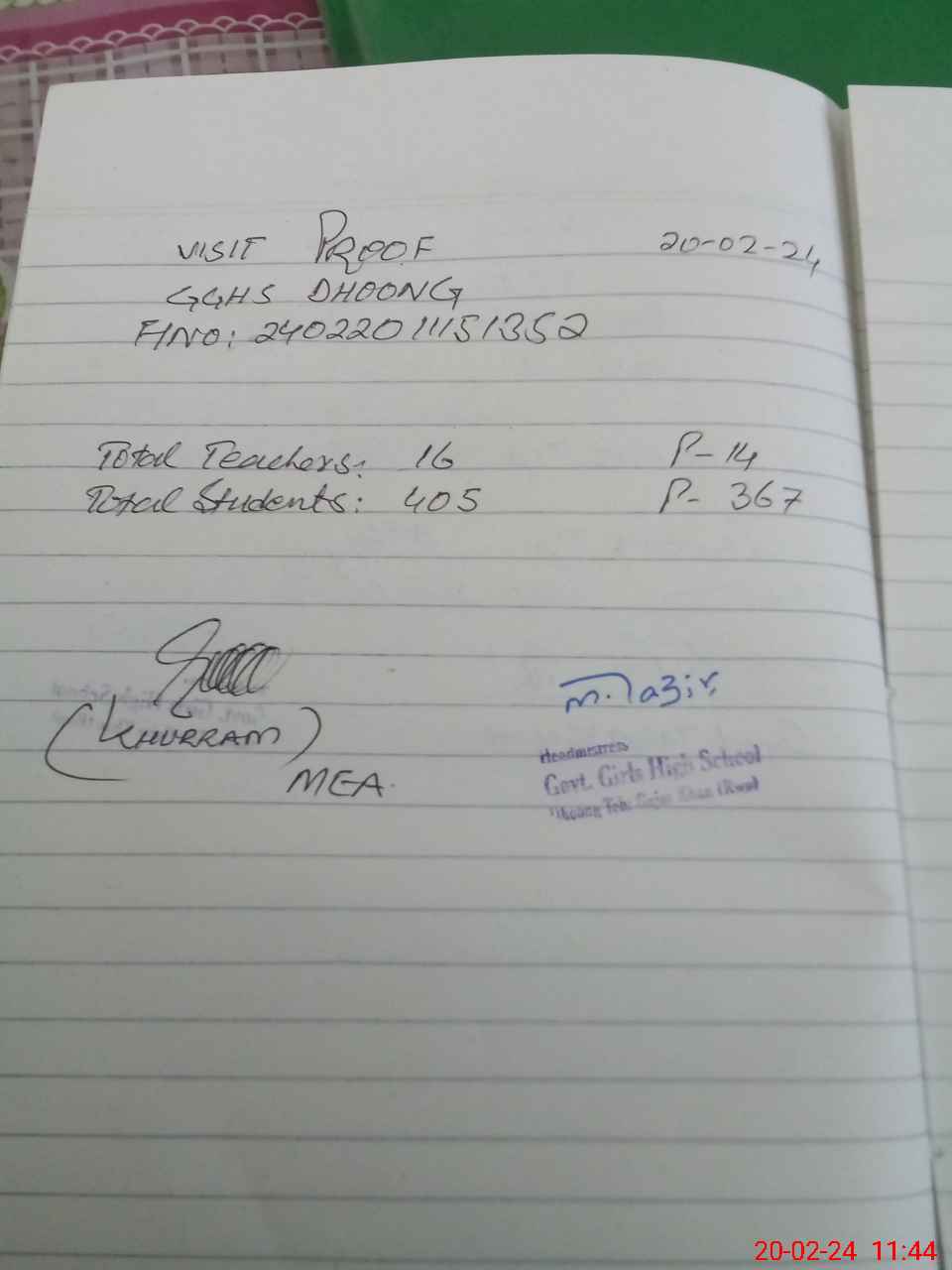| Attendance Register | Head Teacher | MEA with School | Visit Proof |