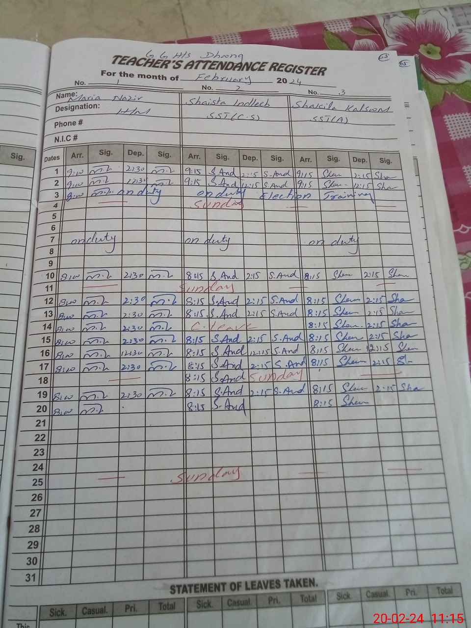 | Leave | Duty | Absent | Maternity | Medical | Ex- Pak |