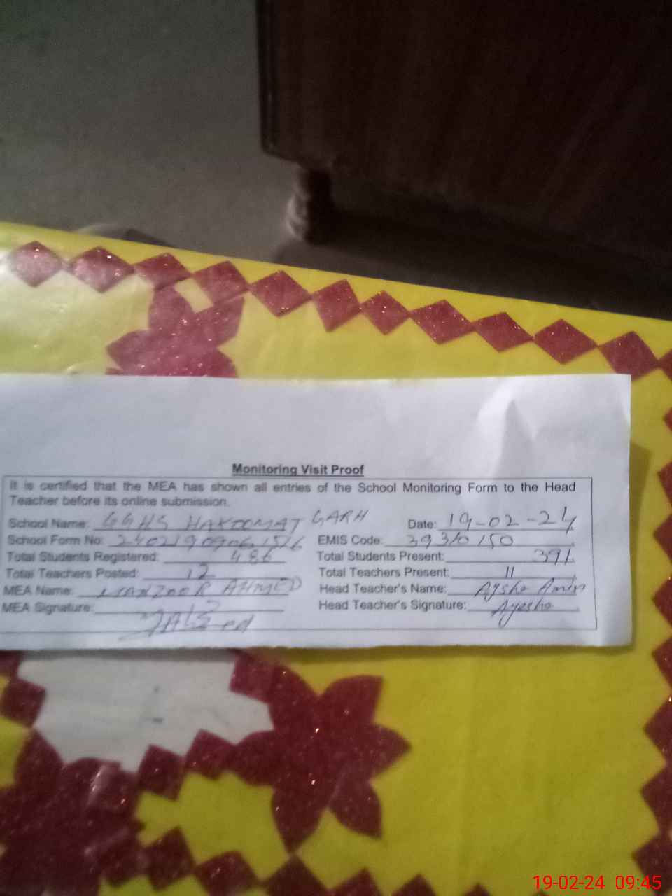 | Name: AY**** AM**** Designation: (School Headmaster's/Headmistress's) S.S.T. Phone/Cell Number: 03**** |
