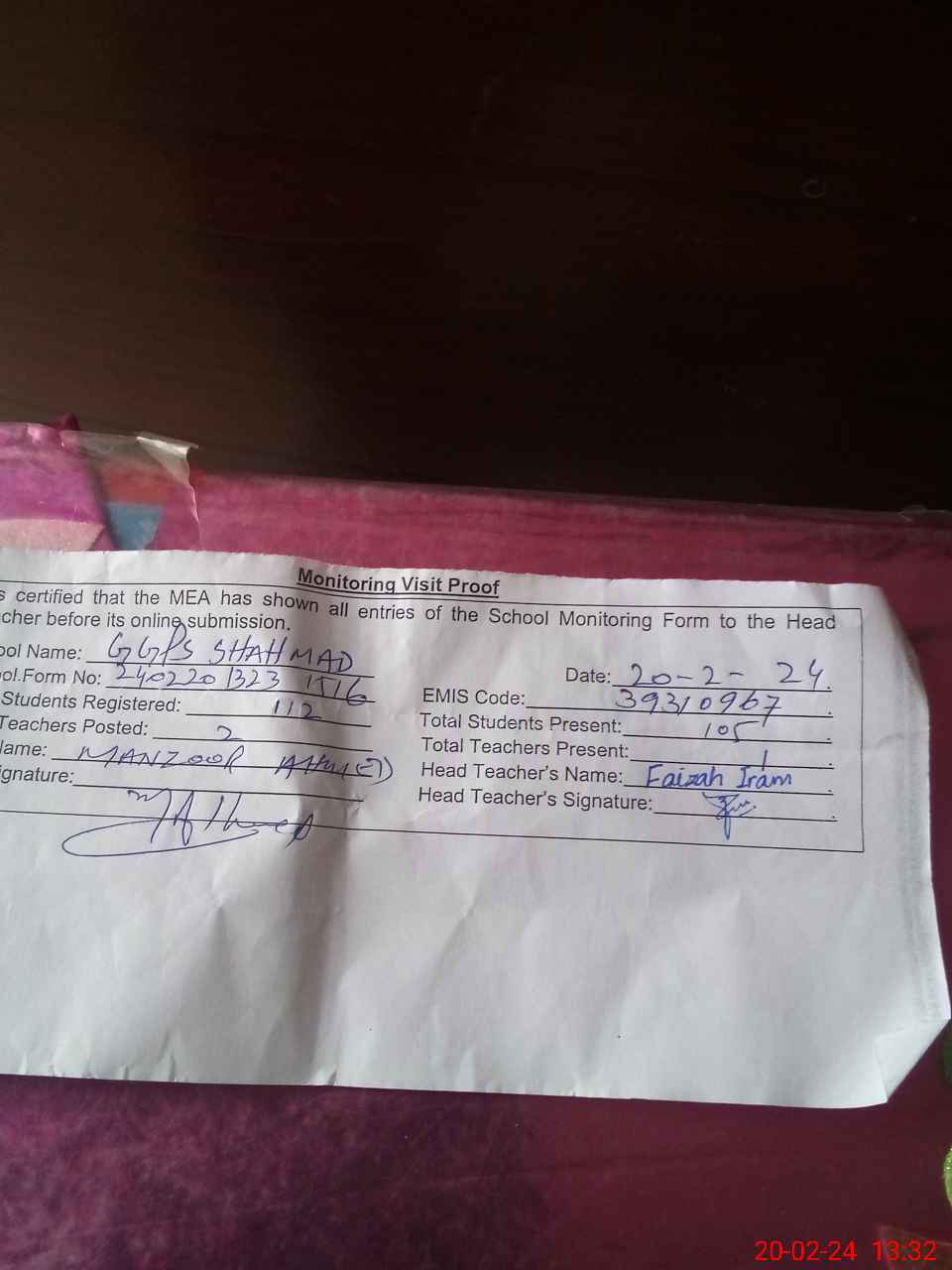 | Attendance Register | Head Teacher | MEA with School | Visit Proof |