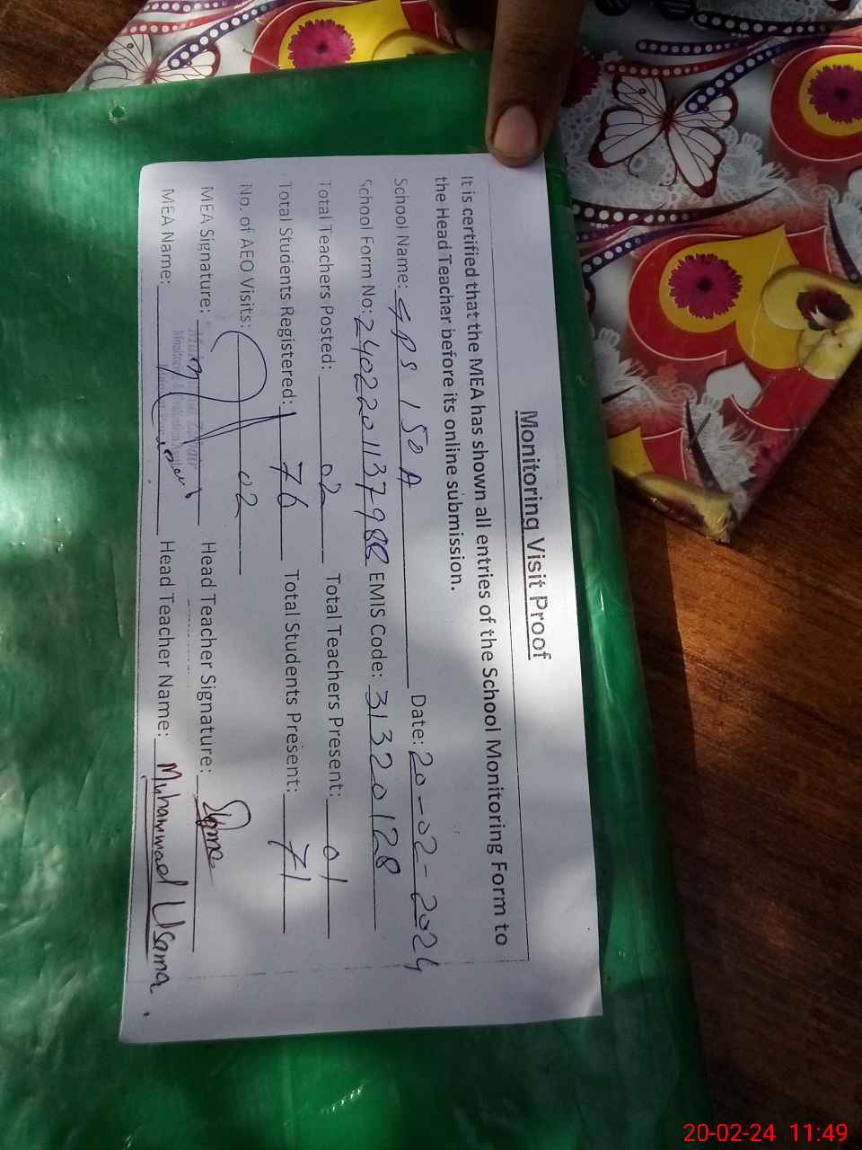 | Attendance Register | Head Teacher | MEA with School | Visit Proof |