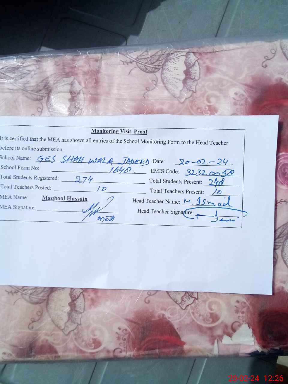 | Attendance Register | Head Teacher | MEA with School | Visit Proof |