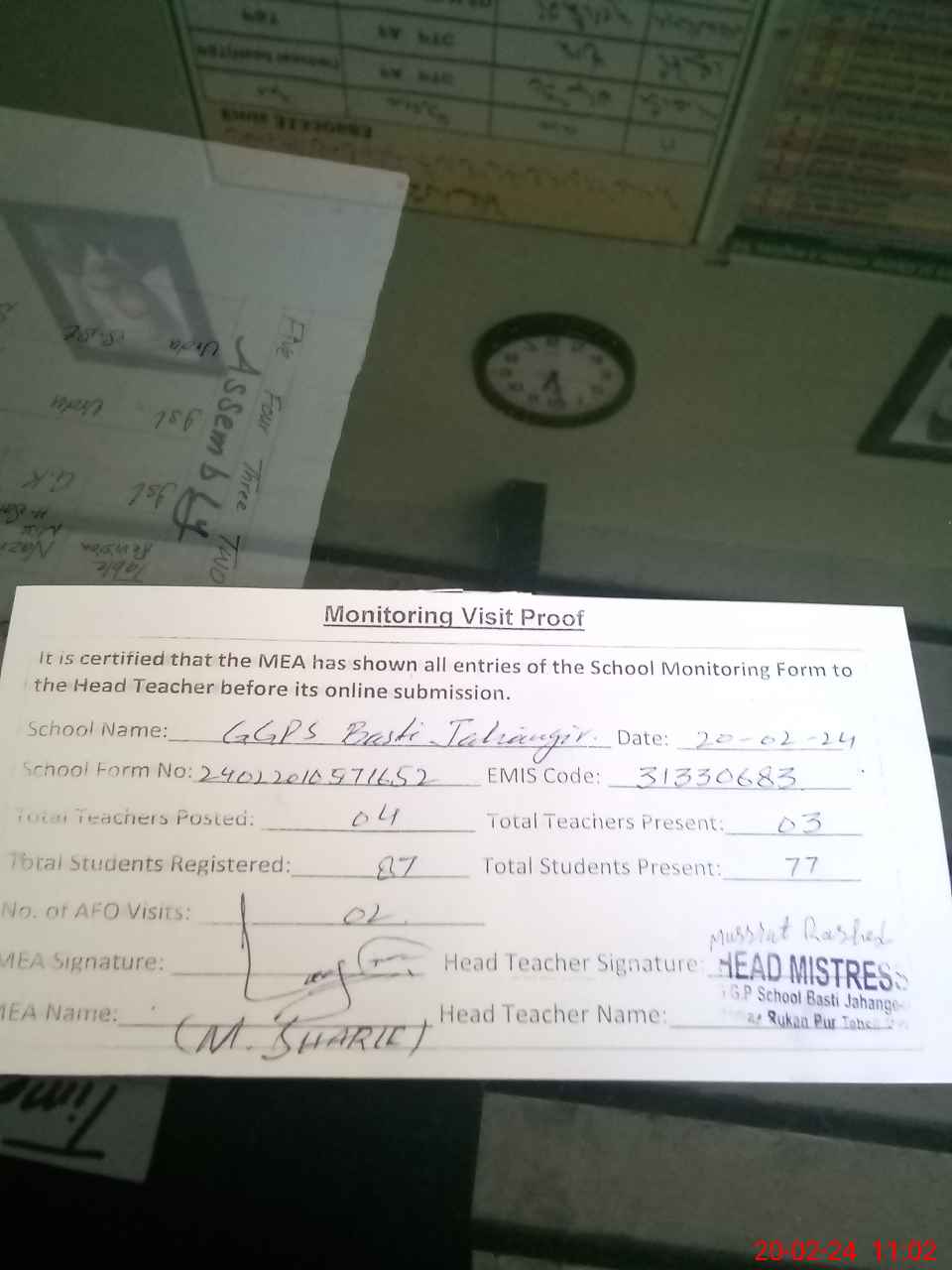 | Attendance Register | Head Teacher | MEA with School | Visit Proof |