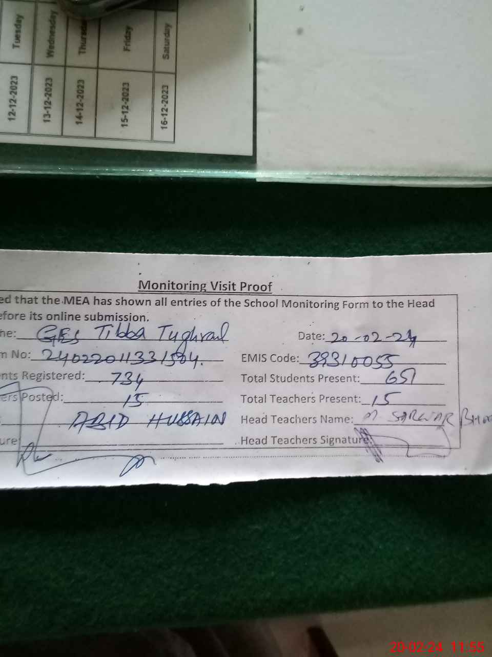| Attendance Register | Head Teacher | MEA with School | Visit Proof |