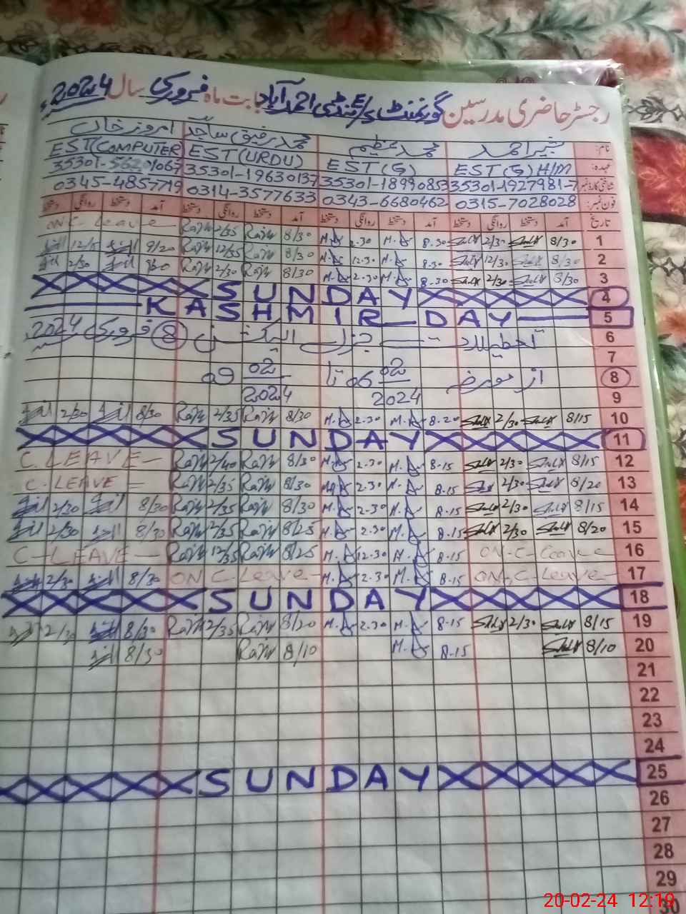 | CNIC | Full Name | Designation | R/C | Absence During Last Calender Month |