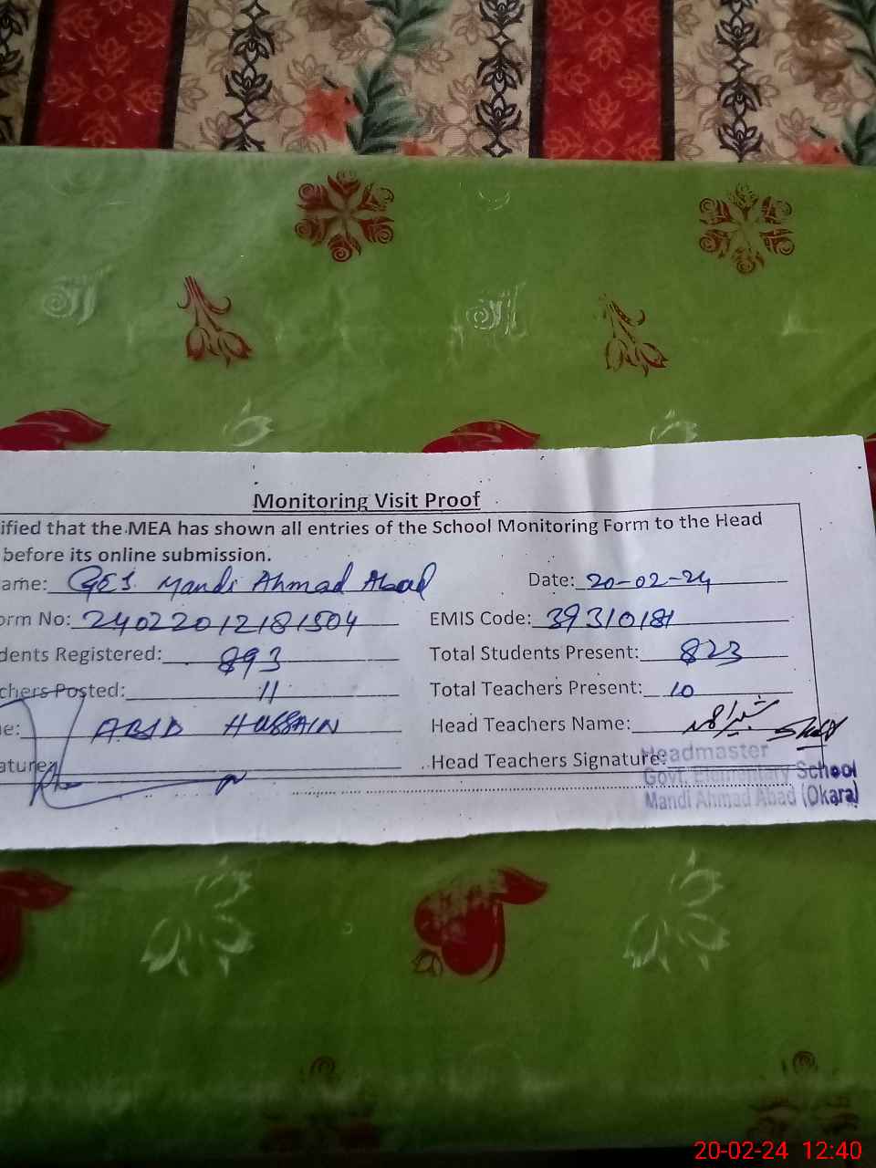 | Attendance Register | Head Teacher | MEA with School | Visit Proof |