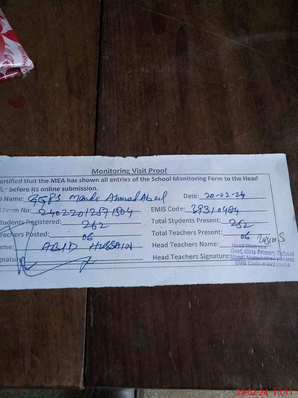 | Attendance Register | Head Teacher | MEA with School | Visit Proof |