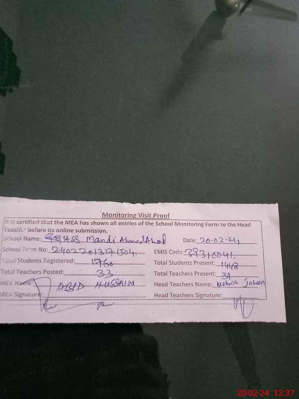 | Attendance Register | Head Teacher | MEA with School | Visit Proof |