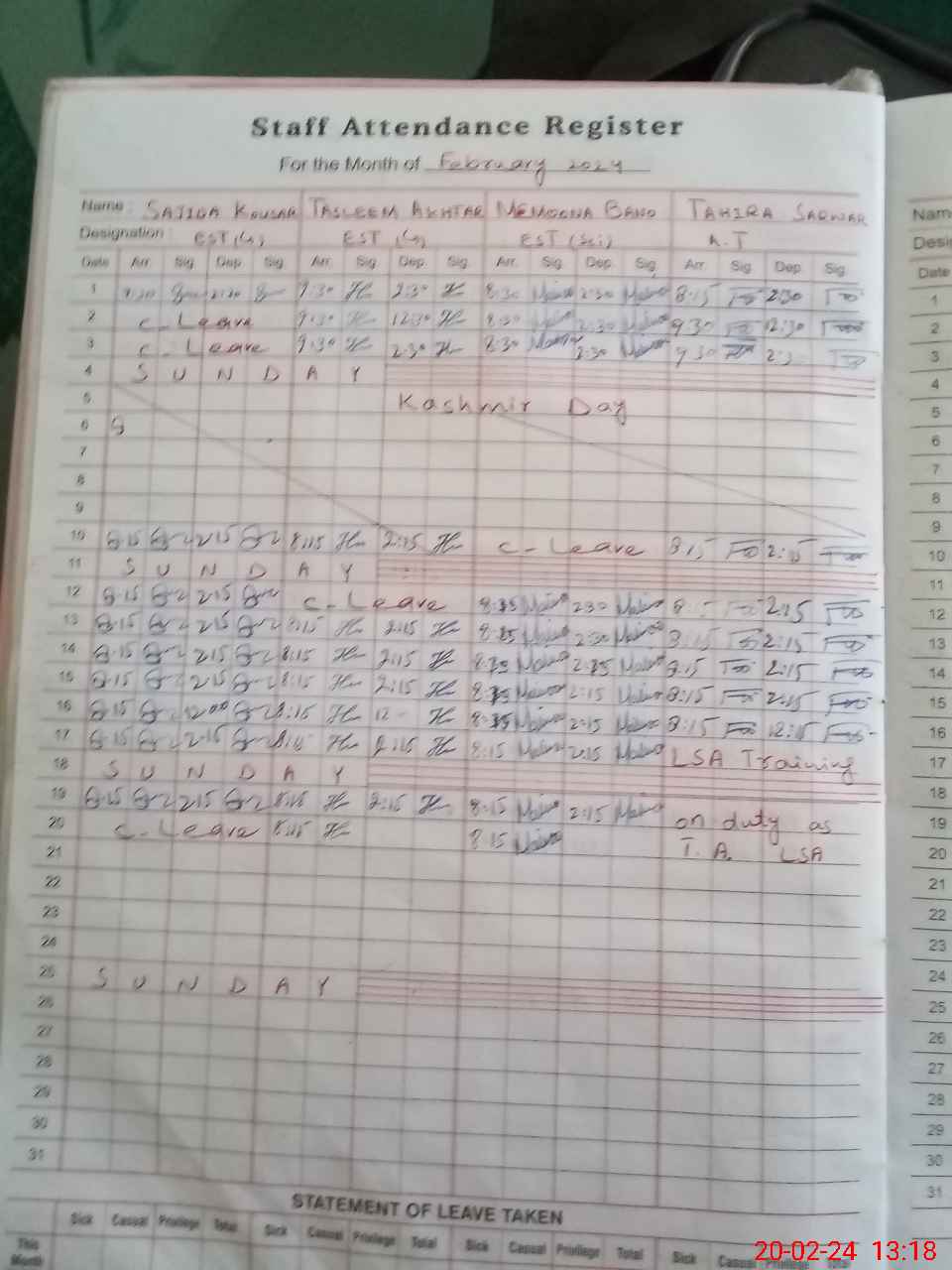 | 35**** | Ta**** Sa**** | 3 | 1 | 0 | 0 | 0 | 0 | 0 | 0 | 0 | 0 | 0 | Exam Duty |
