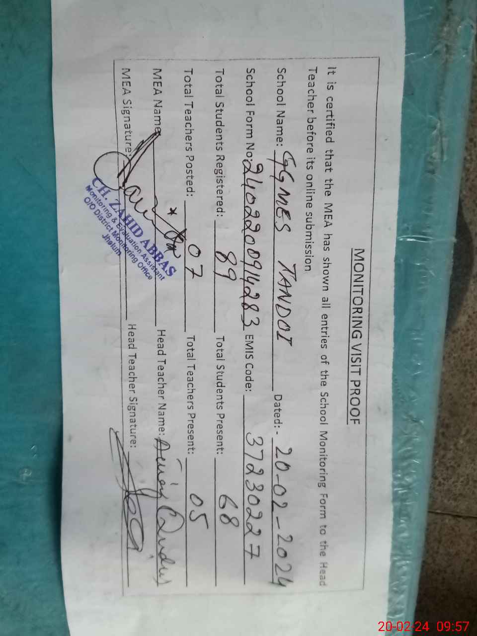 | Attendance Register | Head Teacher | MEA with School | Visit Proof |