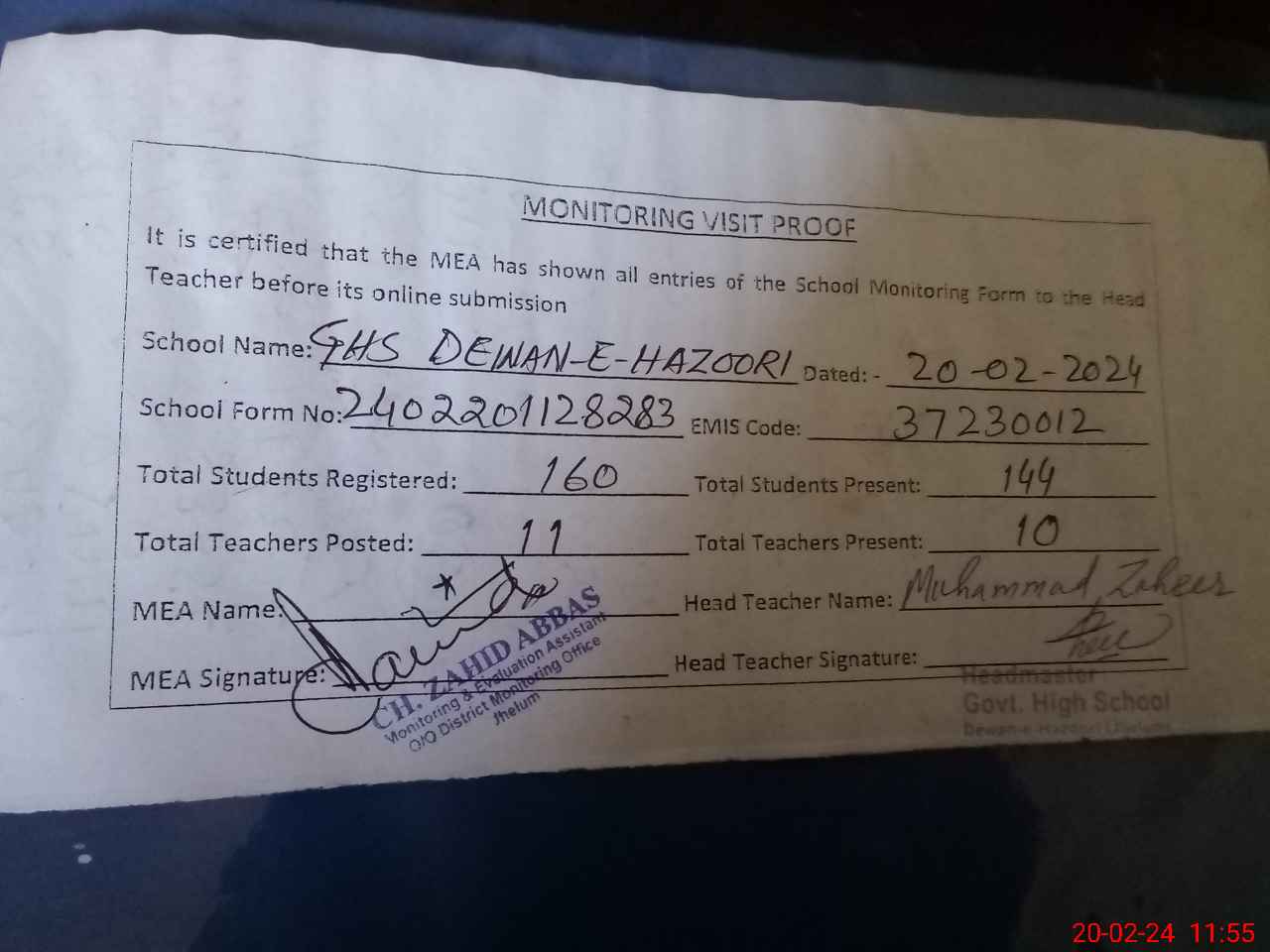 | EMIS Code: 37230012 | Name of School: GHS DEWAN HAZOORI (BISHANDAUR) | |||