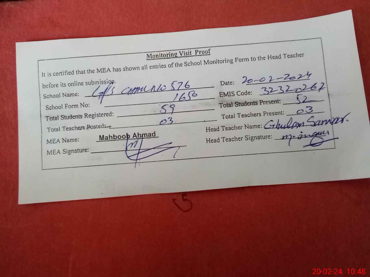 | Attendance Register | Head Teacher | MEA with School | Visit Proof |