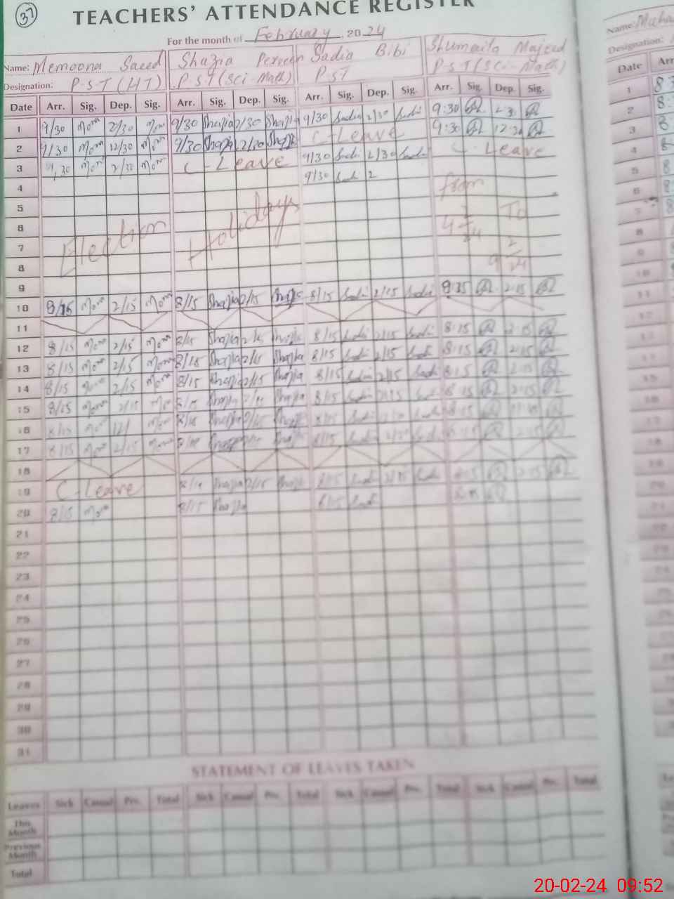| Leave | Duty | Absent | Maternity | Medical | Ex- Pak |