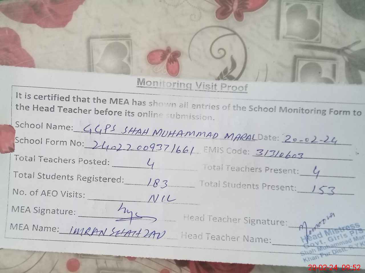| Attendance Register | Head Teacher | MEA with School | Visit Proof |