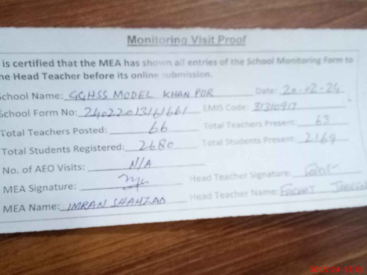 | Attendance Register | Head Teacher | MEA with School | Visit Proof |