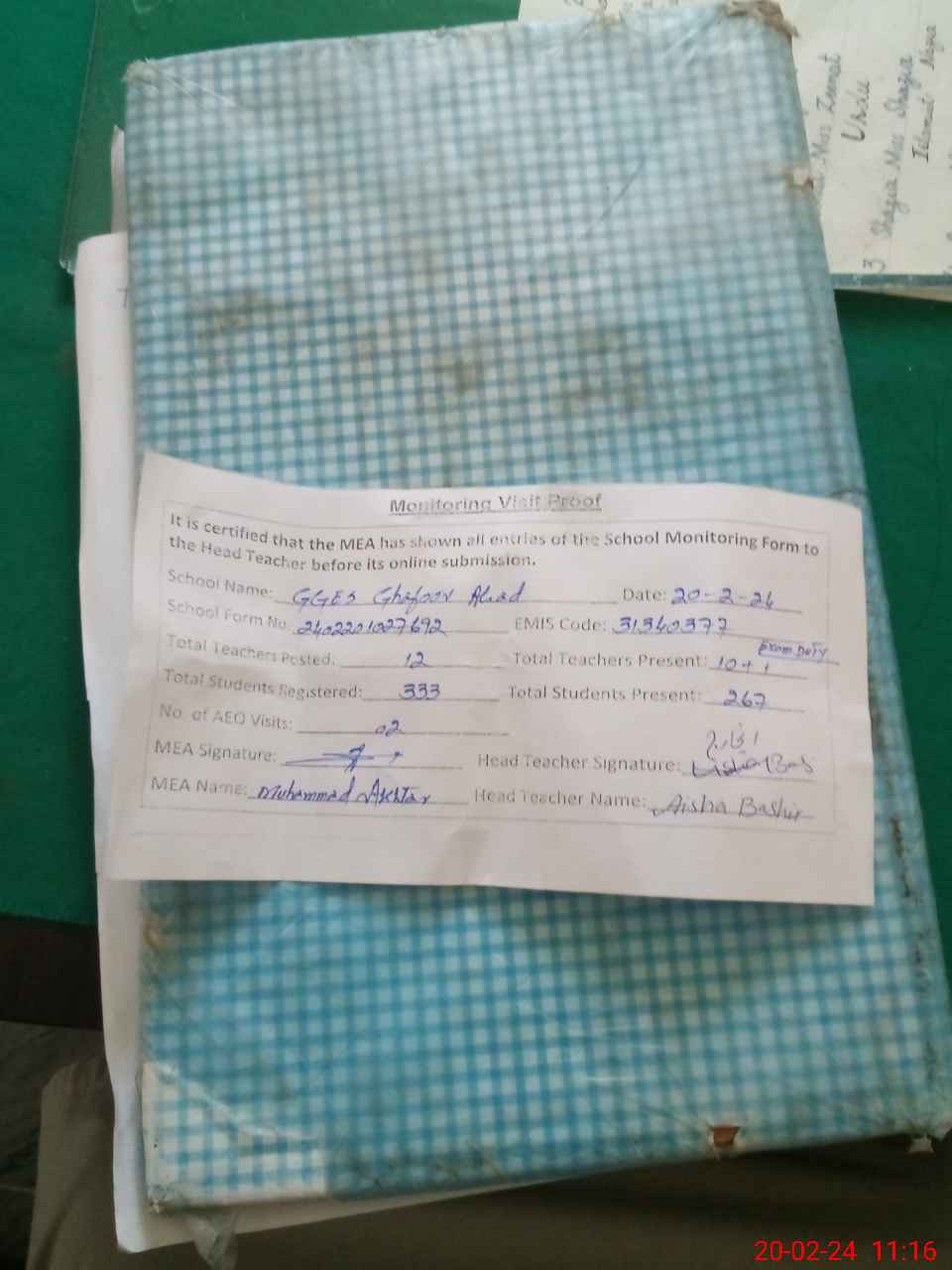 | Attendance Register | Head Teacher | MEA with School | Visit Proof |