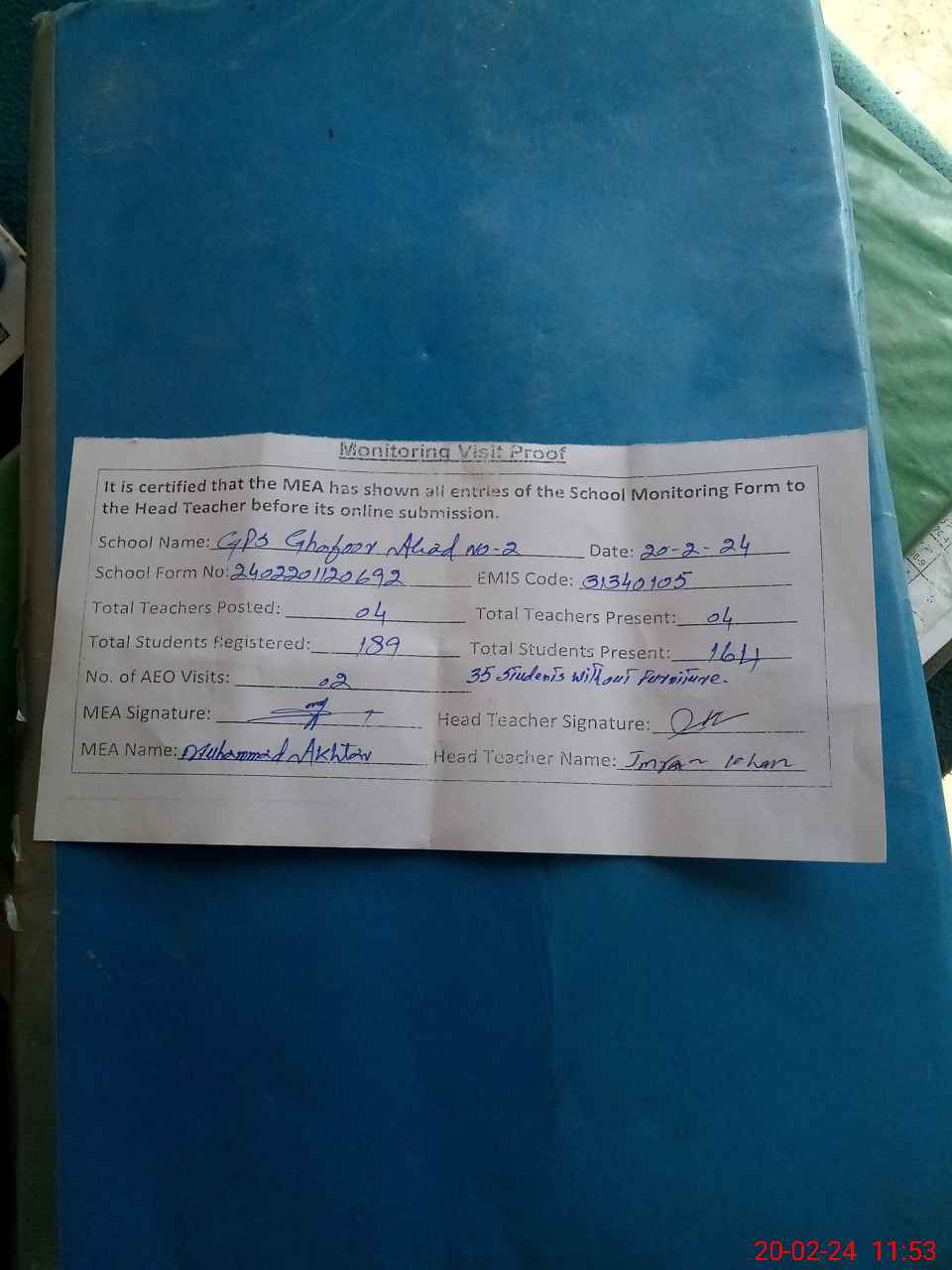 | Attendance Register | Head Teacher | MEA with School | Visit Proof |