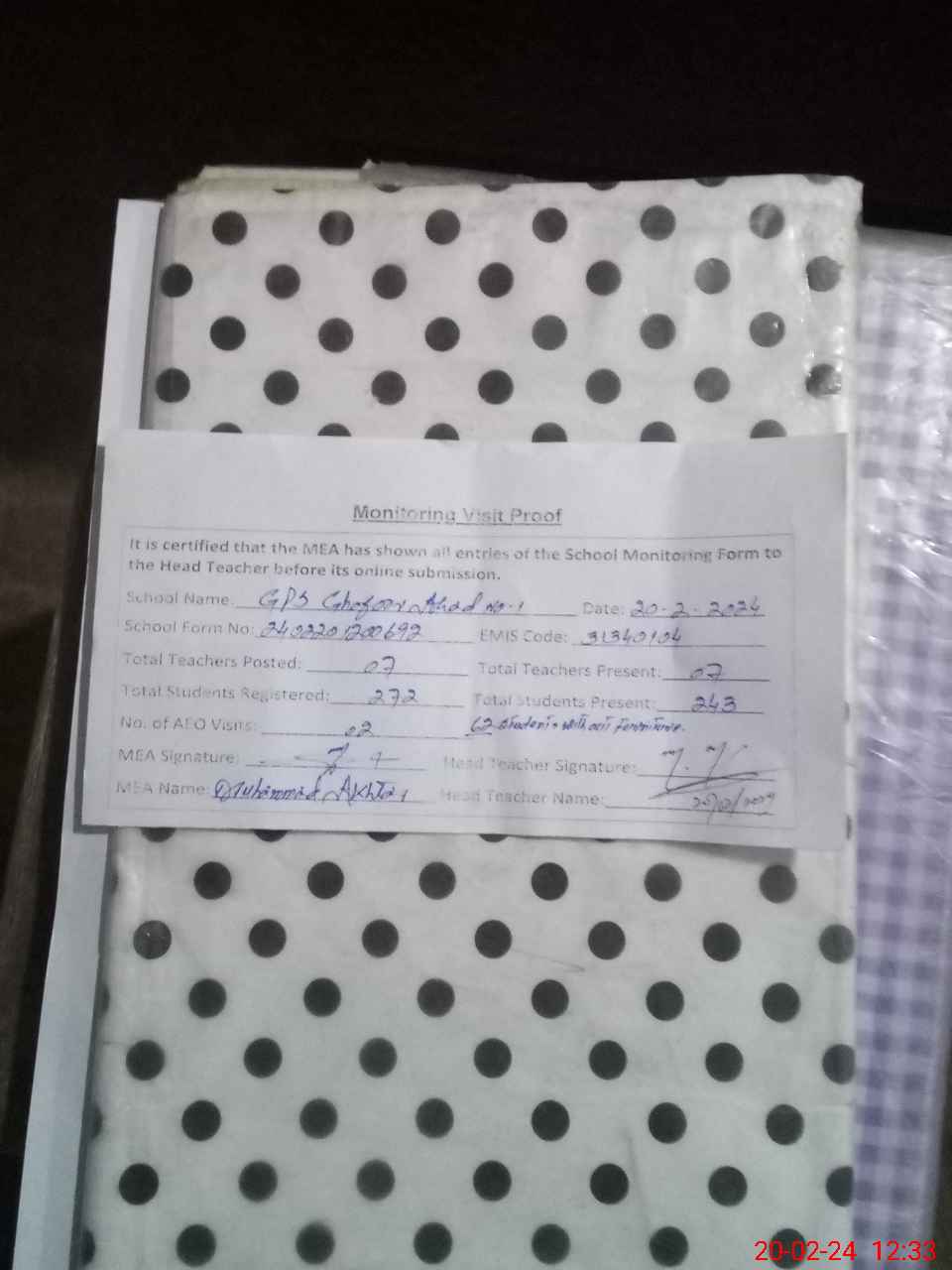 | Attendance Register | Head Teacher | MEA with School | Visit Proof |
