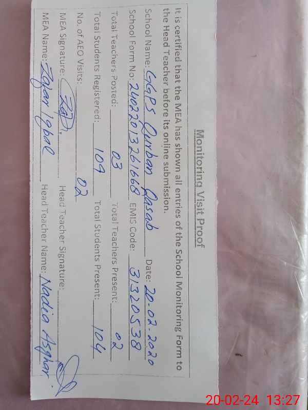 | EMIS Code: 31320538 | Name of School: GGPS BASTI QURBAN QASAB | |||