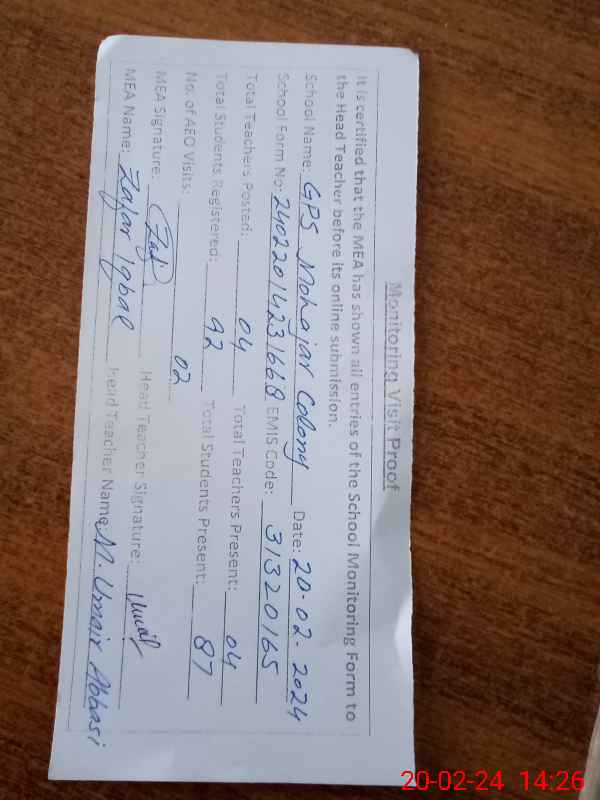 | EMIS Code: 31320165 | Name of School: GPS MAHAJAR COLONY ALLAH ABAD | |||