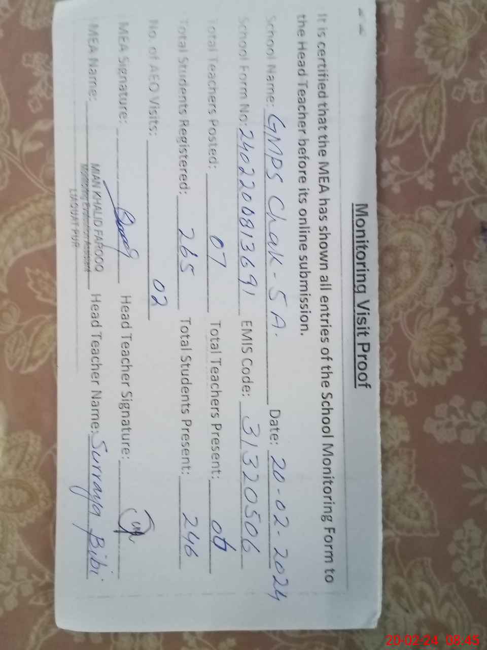 | Attendance Register | Head Teacher | MEA with School | Visit Proof |