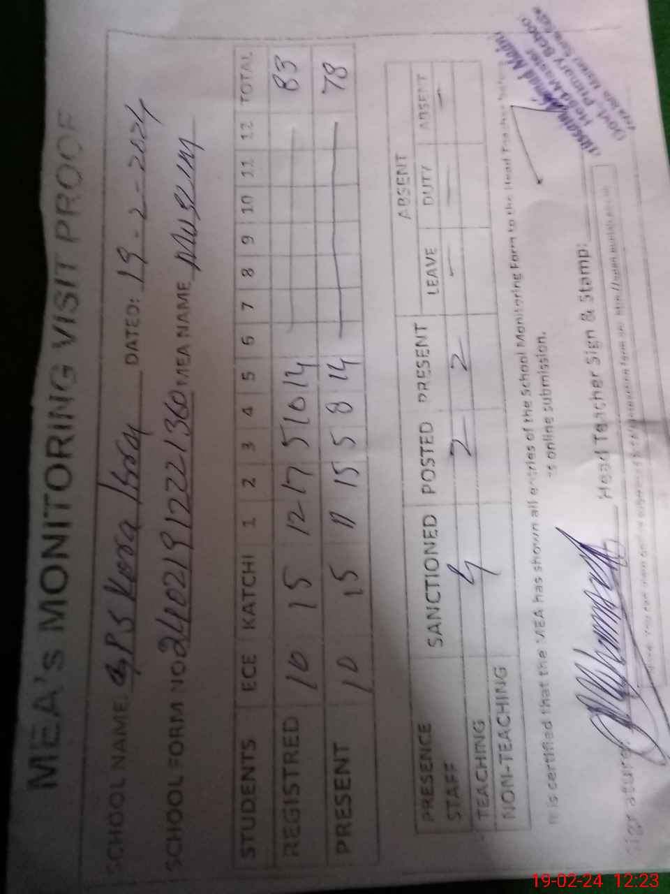 | Attendance Register | Head Teacher | MEA with School | Visit Proof |