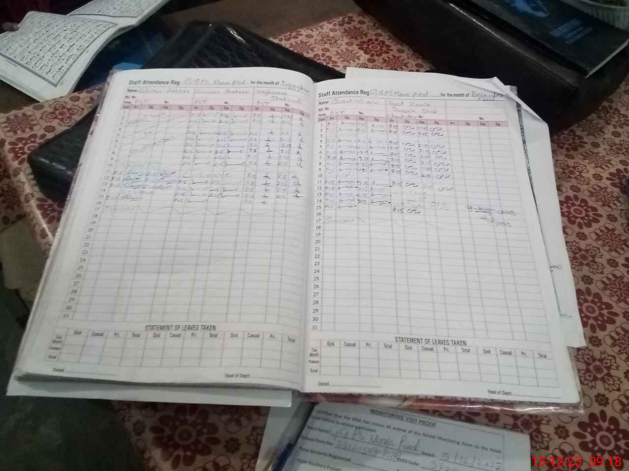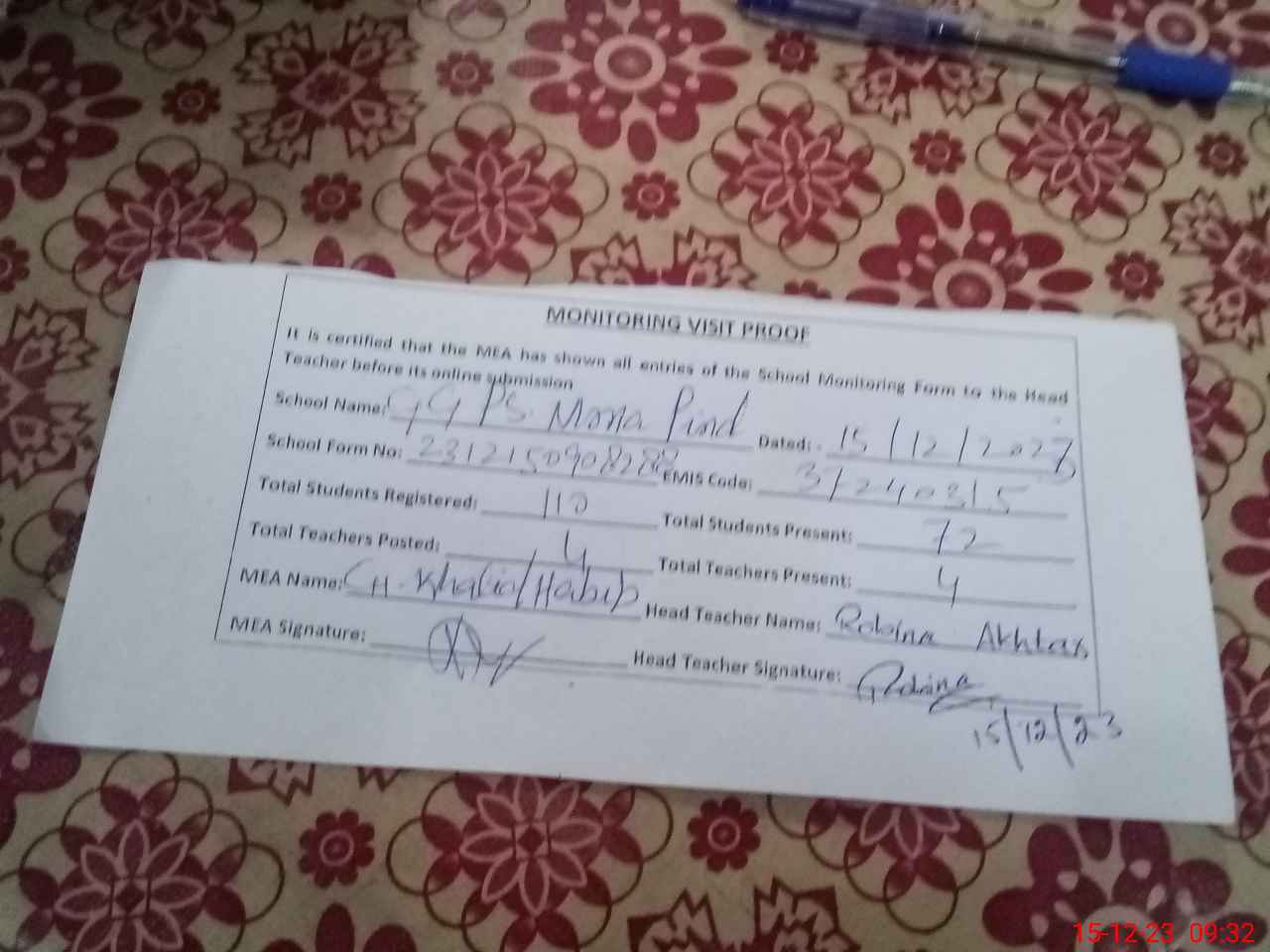 | Attendance Register | Head Teacher | MEA with School | Visit Proof |