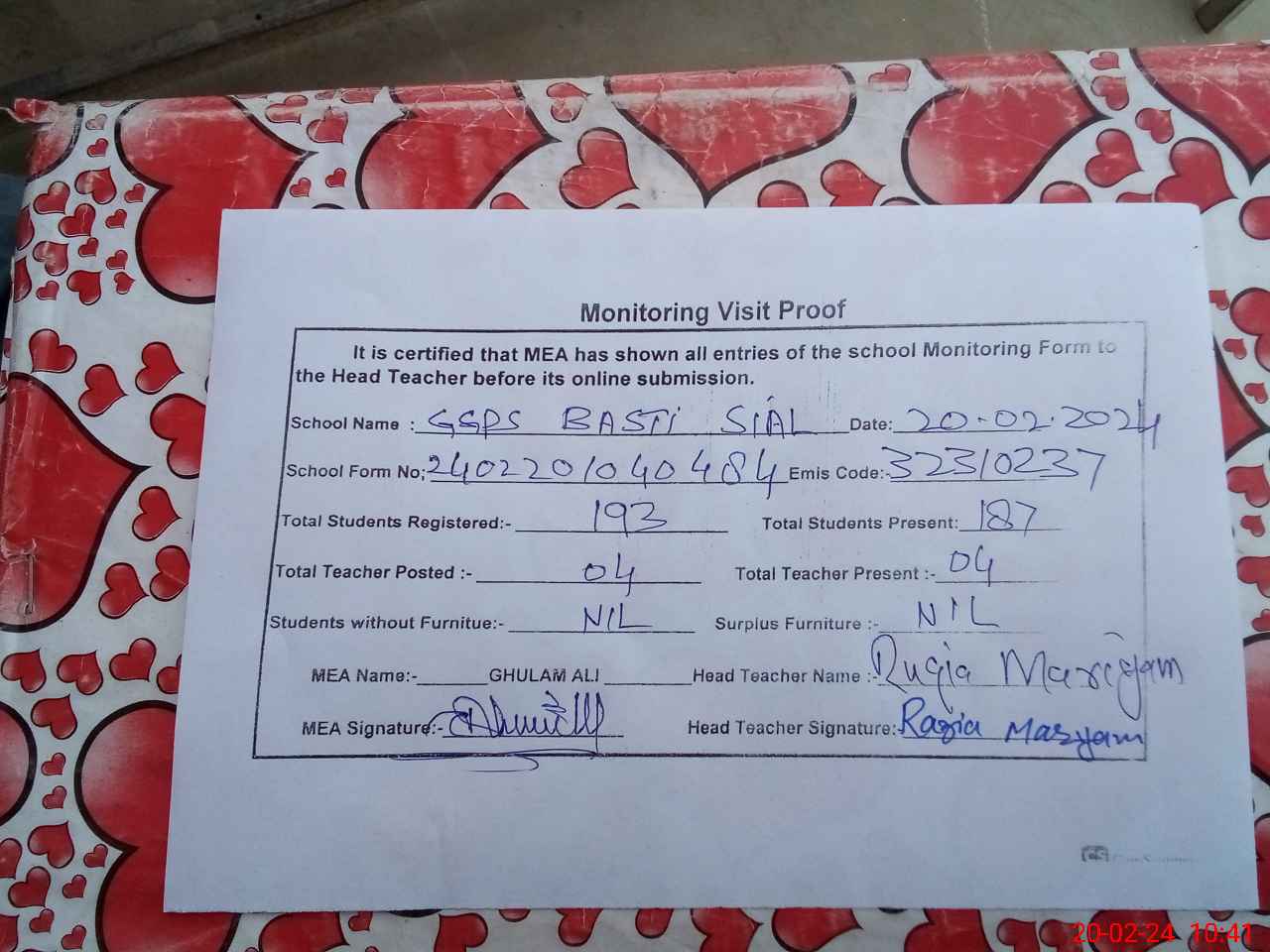 | Attendance Register | Head Teacher | MEA with School | Visit Proof |