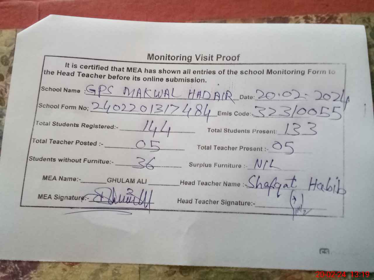 | Attendance Register | Head Teacher | MEA with School | Visit Proof |