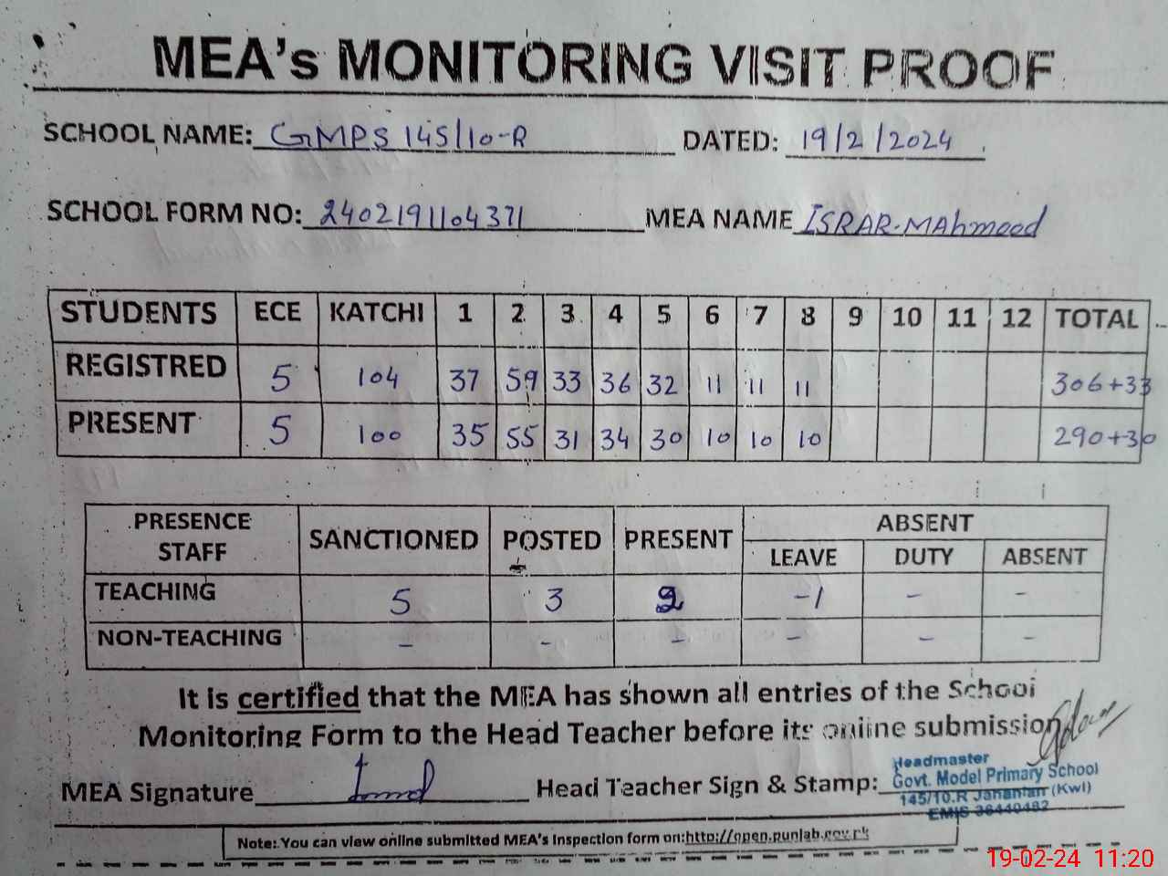 | EMIS Code: 36440482 | Name of School: GMPS 145/10-R, JAHANIAN | |||